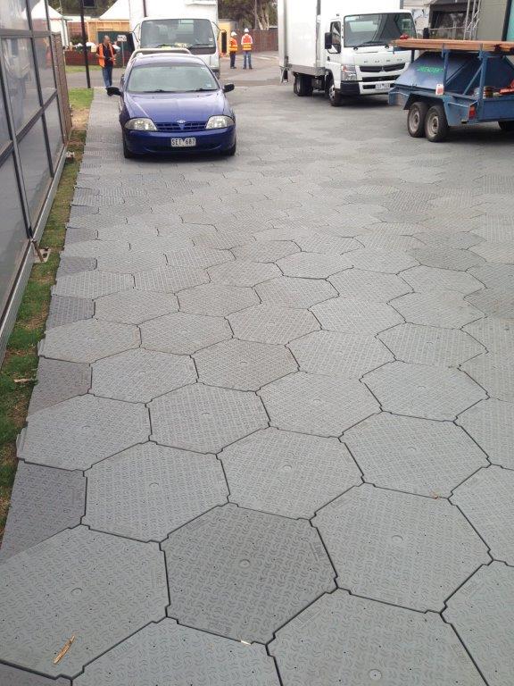 Pro-Track is a superior portable roadway that is tough enough to withstand the heavy impact of trucks, aircraft, earth-moving equipment, machinery, and cars while providing premium grass protection. This durable flooring can also be used as garage flooring tiles and temporary paths, is quick and easy to install and accommodates uneven ground